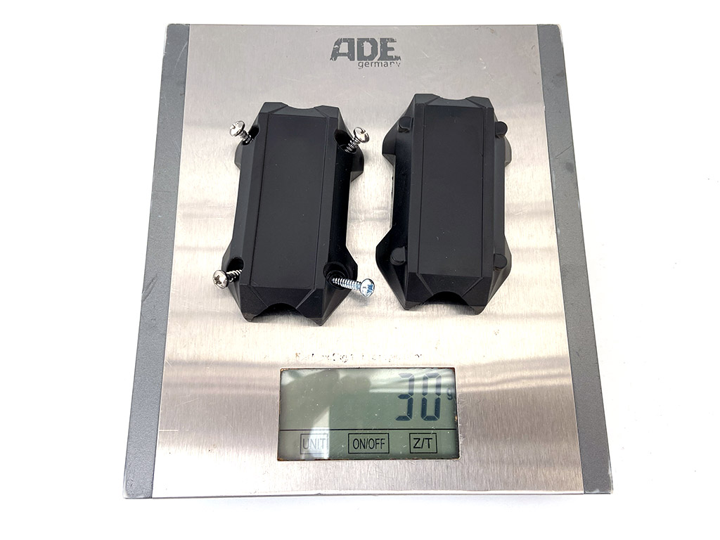 Yep, 30 grams versus 101 grams. Big difference and that really shows in the feel and quality. I’m guessing AS were trying to keep the weight down to a minimum as that’s rather the selling point of their lightweight aluminium crash bars but I honestly think their stock sliders would offer little or no assistance in a heavy fall, so they’re maybe defeating the object.. The unbranded Amazon blocks are made from a nylon polymer that’s much more robust than the plastic AS ones.